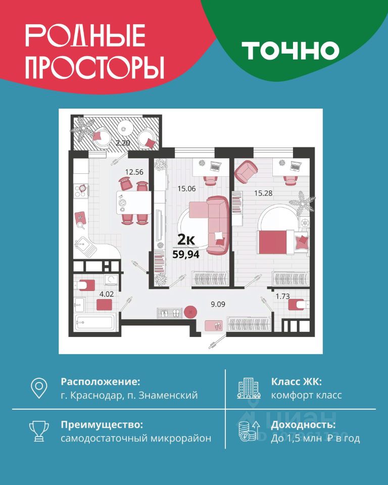 "Родные просторы"- самодостаточный микрорайон, который реализован по принципу комплексного развития территории, где есть вся инфраструктура для комфортной жизни. На территории 41 га 29 домов от 9 до 24 этажей, уютные дворы со спортивными и игровыми площадками, социальные и коммерческие объекты, зеленые массивы и фонтаны. Главная точка притяжения "Родных просторов" - парк семейного отдыха площадью 9 га, 4,5 км прогулочных аллей, амфитеатр для мероприятий, кинофестивальная площадка. Особая гордость микрорайона современная школа на 1550 мест и 3 детских сада "Ладушки", "Веснушки" и "Топотушки" на 880 малышей. В центре микрорайона строятся фитнес-клуб BALANCE с акватермальным комплексом и собственная поликлиника, площадью более 5000 кв.м. Уже открыт православный храм Святых Первоверховных апостолов Петра и Павла.