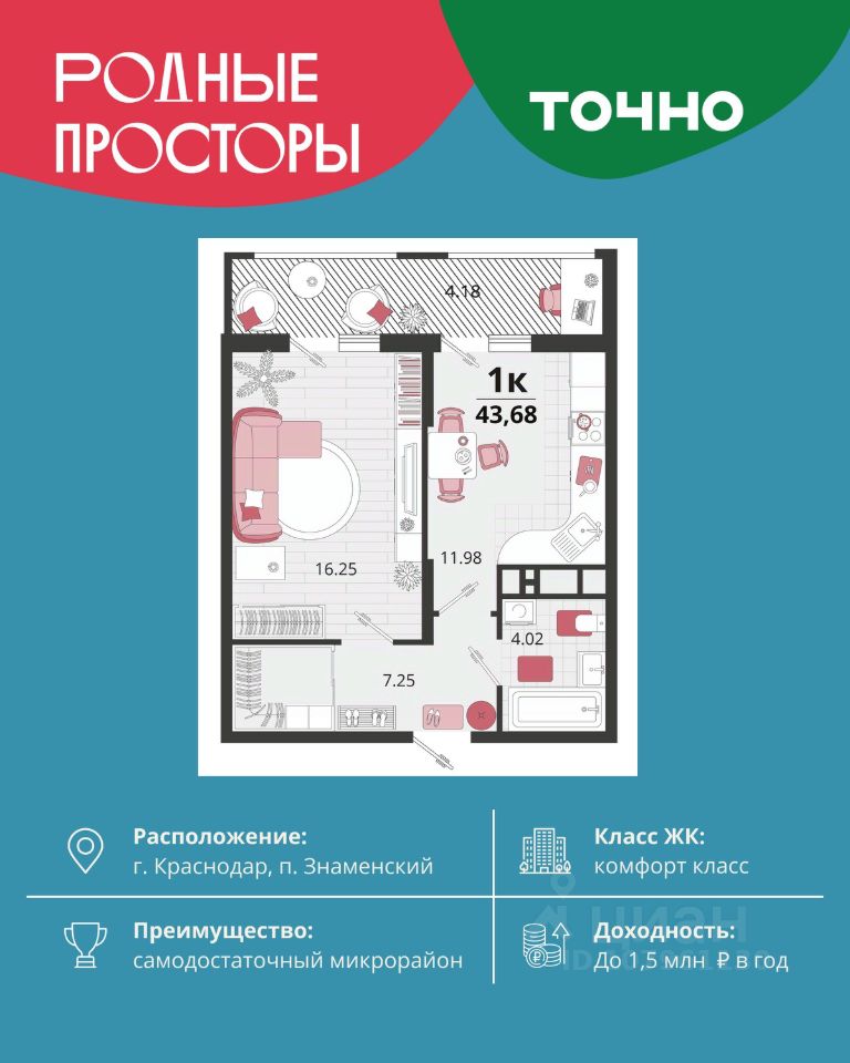 "Родные просторы"- самодостаточный микрорайон, который реализован по принципу комплексного развития территории, где есть вся инфраструктура для комфортной жизни. На территории 41 га 29 домов от 9 до 24 этажей, уютные дворы со спортивными и игровыми площадками, социальные и коммерческие объекты, зеленые массивы и фонтаны. Главная точка притяжения "Родных просторов" - парк семейного отдыха площадью 9 га, 4,5 км прогулочных аллей, амфитеатр для мероприятий, кинофестивальная площадка. Особая гордость микрорайона современная школа на 1550 мест и 3 детских сада "Ладушки", "Веснушки" и "Топотушки" на 880 малышей. В центре микрорайона строятся фитнес-клуб BALANCE с акватермальным комплексом и собственная поликлиника, площадью более 5000 кв.м. Уже открыт православный храм Святых Первоверховных апостолов Петра и Павла.