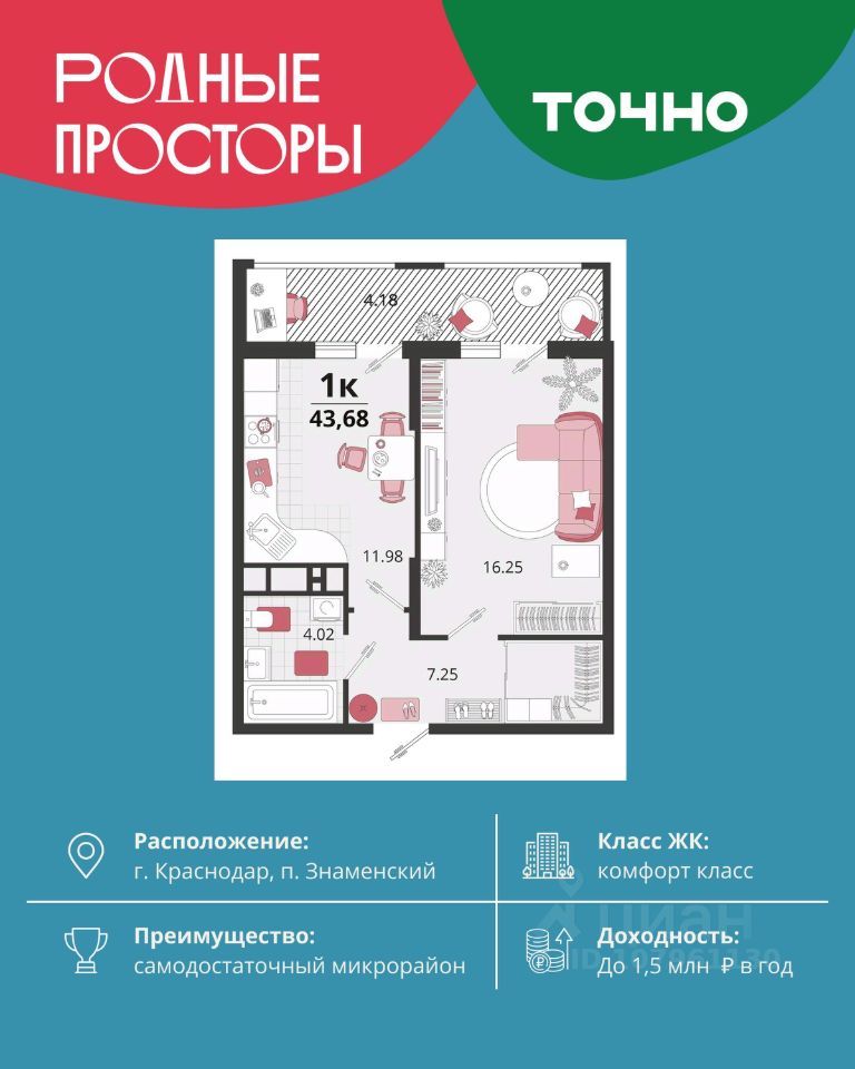 "Родные просторы"- самодостаточный микрорайон, который реализован по принципу комплексного развития территории, где есть вся инфраструктура для комфортной жизни. На территории 41 га 29 домов от 9 до 24 этажей, уютные дворы со спортивными и игровыми площадками, социальные и коммерческие объекты, зеленые массивы и фонтаны. Главная точка притяжения "Родных просторов" - парк семейного отдыха площадью 9 га, 4,5 км прогулочных аллей, амфитеатр для мероприятий, кинофестивальная площадка. Особая гордость микрорайона современная школа на 1550 мест и 3 детских сада "Ладушки", "Веснушки" и "Топотушки" на 880 малышей. В центре микрорайона строятся фитнес-клуб BALANCE с акватермальным комплексом и собственная поликлиника, площадью более 5000 кв.м. Уже открыт православный храм Святых Первоверховных апостолов Петра и Павла.