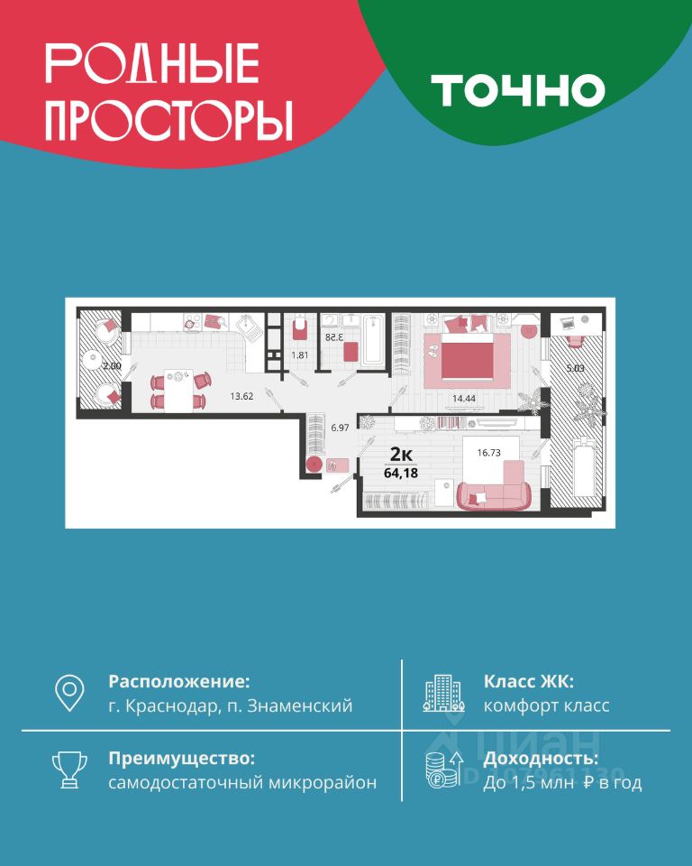 "Родные просторы"- самодостаточный микрорайон, который реализован по принципу комплексного развития территории, где есть вся инфраструктура для комфортной жизни. На территории 41 га 29 домов от 9 до 24 этажей, уютные дворы со спортивными и игровыми площадками, социальные и коммерческие объекты, зеленые массивы и фонтаны. Главная точка притяжения "Родных просторов" - парк семейного отдыха площадью 9 га, 4,5 км прогулочных аллей, амфитеатр для мероприятий, кинофестивальная площадка. Особая гордость микрорайона современная школа на 1550 мест и 3 детских сада "Ладушки", "Веснушки" и "Топотушки" на 880 малышей. В центре микрорайона строятся фитнес-клуб BALANCE с акватермальным комплексом и собственная поликлиника, площадью более 5000 кв.м. Уже открыт православный храм Святых Первоверховных апостолов Петра и Павла.