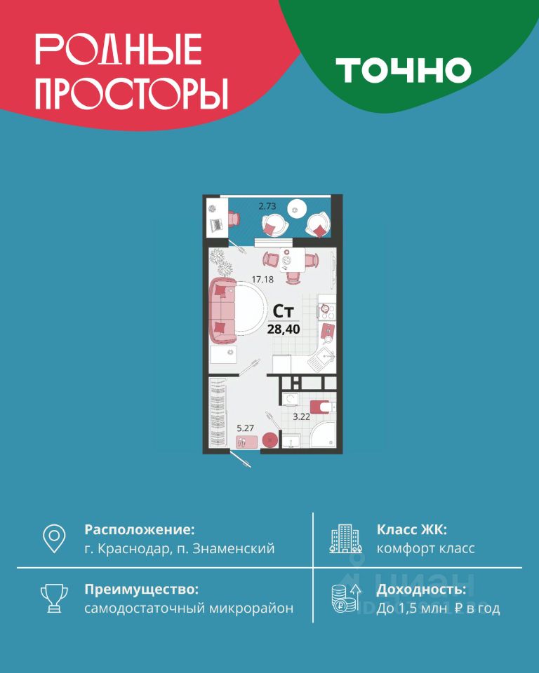 "Родные просторы"- самодостаточный микрорайон, который реализован по принципу комплексного развития территории, где есть вся инфраструктура для комфортной жизни. На территории 41 га 29 домов от 9 до 24 этажей, уютные дворы со спортивными и игровыми площадками, социальные и коммерческие объекты, зеленые массивы и фонтаны. Главная точка притяжения "Родных просторов" - парк семейного отдыха площадью 9 га, 4,5 км прогулочных аллей, амфитеатр для мероприятий, кинофестивальная площадка. Особая гордость микрорайона современная школа на 1550 мест и 3 детских сада "Ладушки", "Веснушки" и "Топотушки" на 880 малышей. В центре микрорайона строятся фитнес-клуб BALANCE с акватермальным комплексом и собственная поликлиника, площадью более 5000 кв.м. Уже открыт православный храм Святых Первоверховных апостолов Петра и Павла.