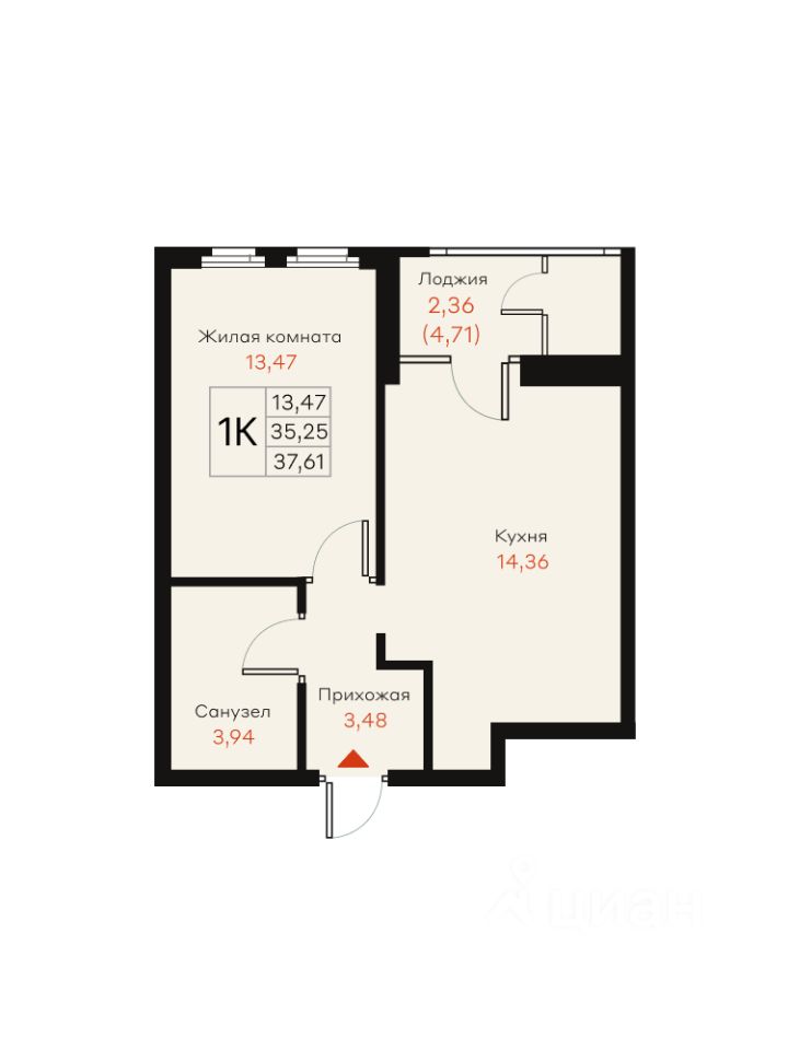 Общая площадь37,61 м²