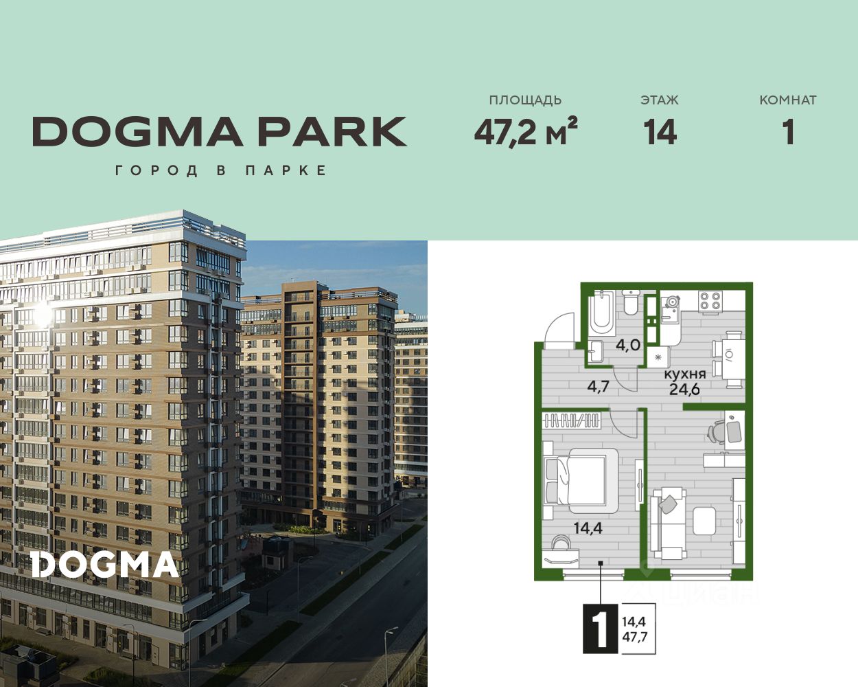 В продаже 1-комнатная квартира от застройщика! Мкр. "DOGMA PARK" г. Краснодар, Литер 3 Срок сдачи: 4 кв. 2026, общей площадью 47.2 кв.м., на 14 этаже.
