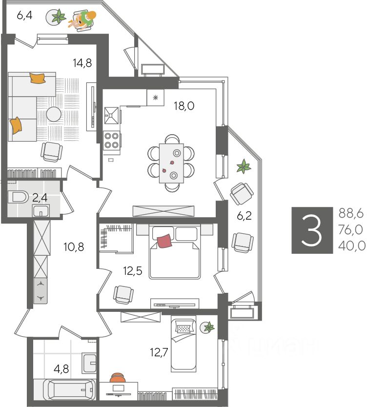 В продаже 3-комнатная квартира от застройщика! ЖК "Рекорд" 2 очередь, г. Краснодар, Литер 6 Срок сдачи: 4 кв. 2026, общей площадью 88.6 кв.м., на 2 этаже.