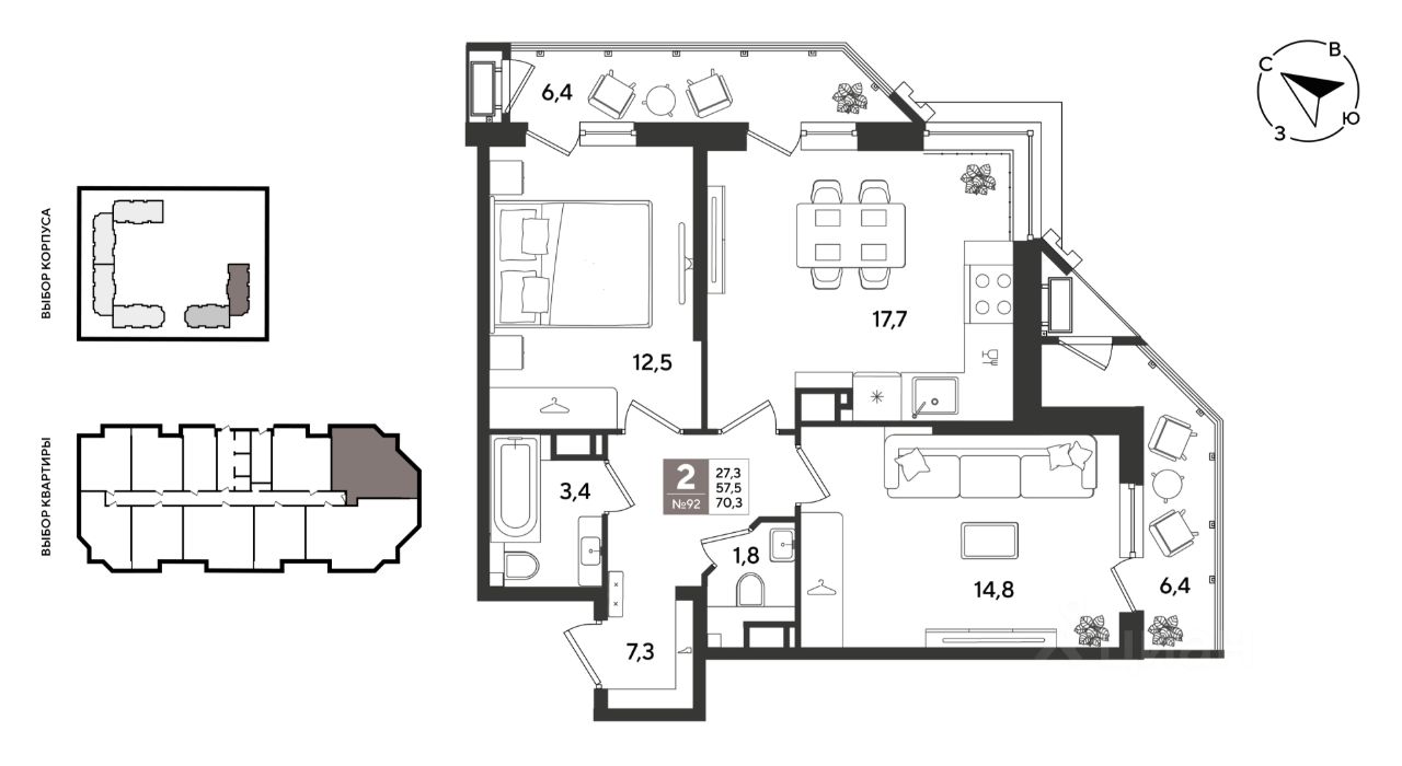 В продаже 2-к квартира от застройщика! ЖК "Рекорд" 2 очередь, г. Краснодар, Литер 6. Срок сдачи: 2 кв. 2026, общей площадью 70.3 кв.м., на 11 этаже.