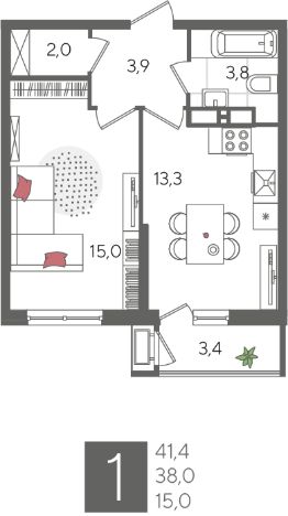В продаже 1-комнатная квартира от застройщика! ЖК "Рекорд" 2 очередь, г. Краснодар, Литер 6 Срок сдачи: 4 кв. 2026, общей площадью 41.4 кв.м., на 11 этаже.
