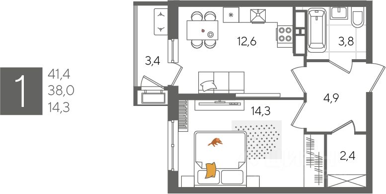 В продаже 1-комнатная квартира от застройщика! ЖК "Рекорд" 2 очередь, г. Краснодар, Литер 6 Срок сдачи: 4 кв. 2026, общей площадью 41.4 кв.м., на 11 этаже.