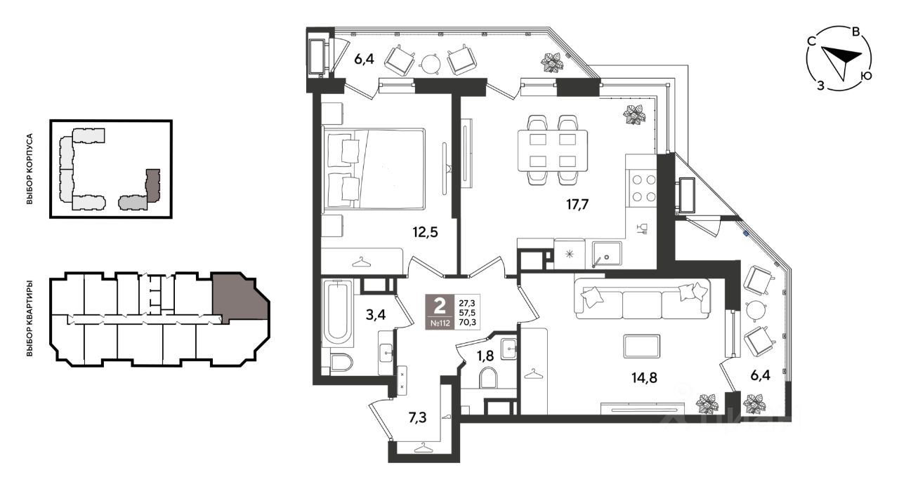 В продаже 2-к квартира от застройщика! ЖК "Рекорд" 2 очередь, г. Краснодар, Литер 6. Срок сдачи: 2 кв. 2026, общей площадью 70.3 кв.м., на 13 этаже.
