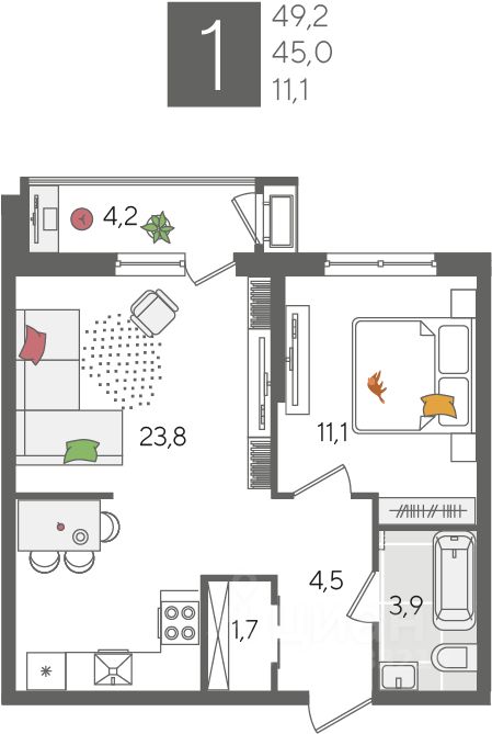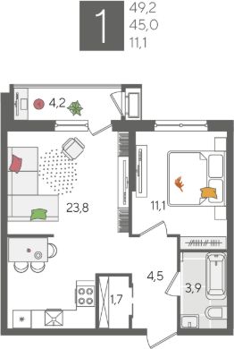 В продаже 1-к квартира от застройщика! ЖК "Рекорд" 2 очередь, г. Краснодар, Литер 6. Срок сдачи: 2 кв. 2026, общей площадью 49.2 кв.м., на 2 этаже.