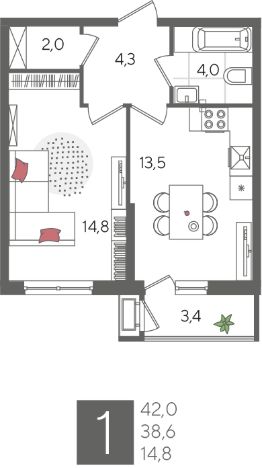 В продаже 1-комнатная квартира от застройщика! ЖК "Рекорд" 2 очередь, г. Краснодар, Литер 6 Срок сдачи: 4 кв. 2026, общей площадью 42 кв.м., на 2 этаже.