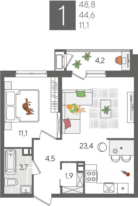 В продаже 1-комнатная квартира от застройщика! ЖК "Рекорд" 2 очередь, г. Краснодар, Литер 6 Срок сдачи: 4 кв. 2026, общей площадью 48.8 кв.м., на 8 этаже.
