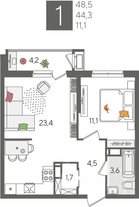 В продаже 1-комнатная квартира от застройщика! ЖК "Рекорд" 2 очередь, г. Краснодар, Литер 6 Срок сдачи: 4 кв. 2026, общей площадью 48.5 кв.м., на 15 этаже.
