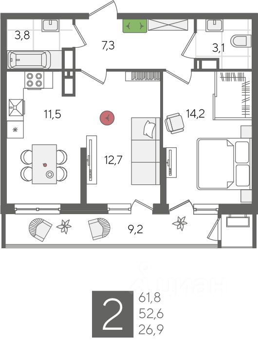В продаже 2-комнатная квартира от застройщика! ЖК "Рекорд" 2 очередь, г. Краснодар, Литер 6 Срок сдачи: 4 кв. 2026, общей площадью 61.8 кв.м., на 23 этаже.