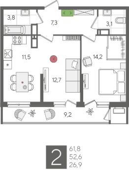 В продаже 2-комнатная квартира от застройщика! ЖК "Рекорд" 2 очередь, г. Краснодар, Литер 6 Срок сдачи: 4 кв. 2026, общей площадью 61.8 кв.м., на 24 этаже.