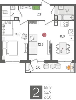 В продаже 2-комнатная квартира от застройщика! ЖК "Рекорд" 2 очередь, г. Краснодар, Литер 5 Срок сдачи: 4 кв. 2026, общей площадью 58.9 кв.м., на 8 этаже.