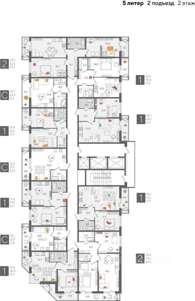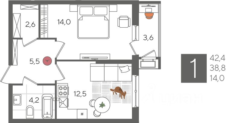 В продаже 1-комнатная квартира от застройщика! ЖК "Рекорд" 2 очередь, г. Краснодар, Литер 5 Срок сдачи: 4 кв. 2026, общей площадью 42.4 кв.м., на 2 этаже.