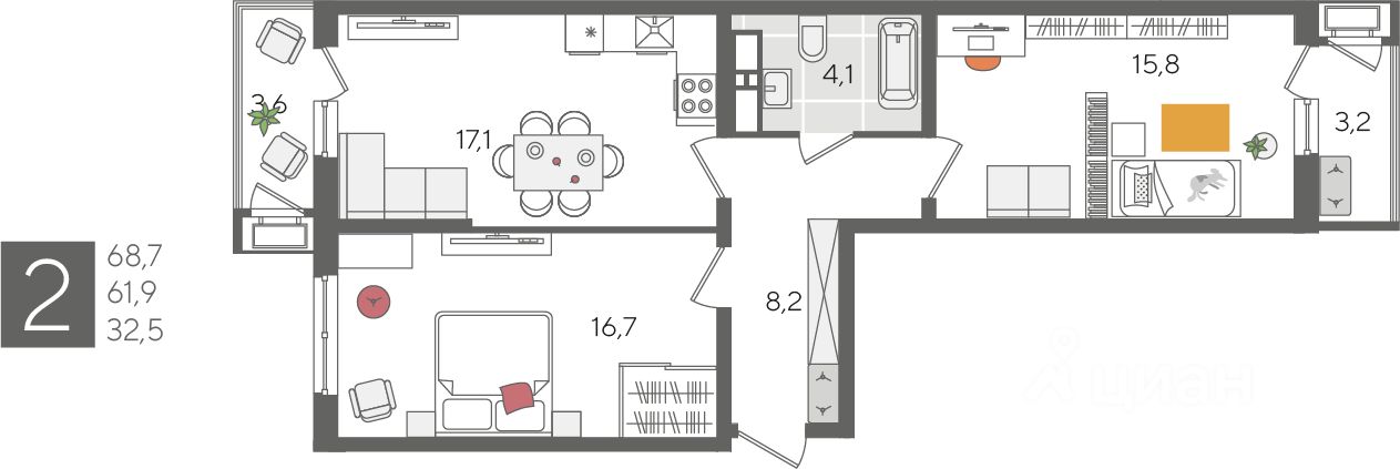 В продаже 2-комнатная квартира от застройщика! ЖК "Рекорд" 2 очередь, г. Краснодар, Литер 5 Срок сдачи: 4 кв. 2026, общей площадью 68.7 кв.м., на 12 этаже.