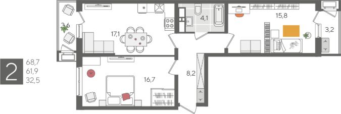 В продаже 2-комнатная квартира от застройщика! ЖК "Рекорд" 2 очередь, г. Краснодар, Литер 5 Срок сдачи: 4 кв. 2026, общей площадью 68.7 кв.м., на 13 этаже.