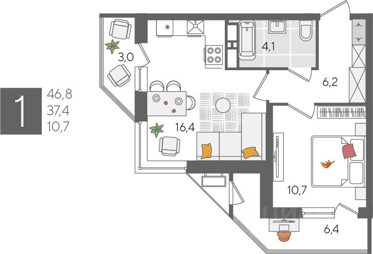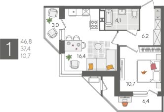 В продаже 1-комнатная квартира от застройщика! ЖК "Рекорд" 2 очередь, г. Краснодар, Литер 5 Срок сдачи: 4 кв. 2026, общей площадью 46.8 кв.м., на 20 этаже.