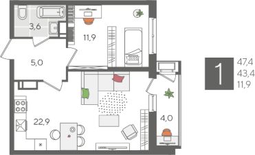 В продаже 1-комнатная квартира от застройщика! ЖК "Рекорд" 2 очередь, г. Краснодар, Литер 5 Срок сдачи: 4 кв. 2026, общей площадью 47.4 кв.м., на 21 этаже.