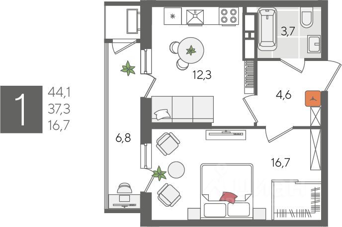 В продаже 1-комнатная квартира от застройщика! ЖК "Рекорд" 2 очередь, г. Краснодар, Литер 5 Срок сдачи: 4 кв. 2026, общей площадью 44.1 кв.м., на 22 этаже.