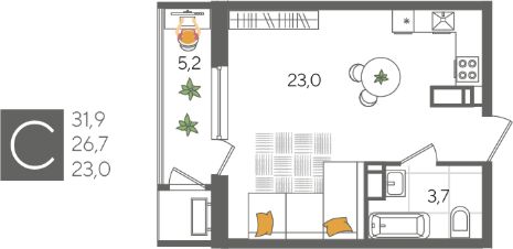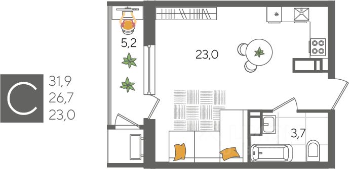 В продаже квартира-студия от застройщика! ЖК "Рекорд" 2 очередь, г. Краснодар, Литер 5 Срок сдачи: 4 кв. 2026, общей площадью 31.9 кв.м., на 23 этаже.