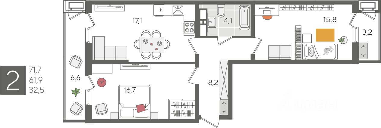 В продаже 2-комнатная квартира от застройщика! ЖК "Рекорд" 2 очередь, г. Краснодар, Литер 5 Срок сдачи: 4 кв. 2026, общей площадью 71.7 кв.м., на 23 этаже.