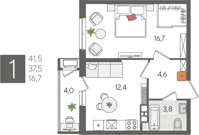 В продаже 1-комнатная квартира от застройщика! ЖК "Рекорд" 2 очередь, г. Краснодар, Литер 5 Срок сдачи: 4 кв. 2026, общей площадью 41.5 кв.м., на 3 этаже.