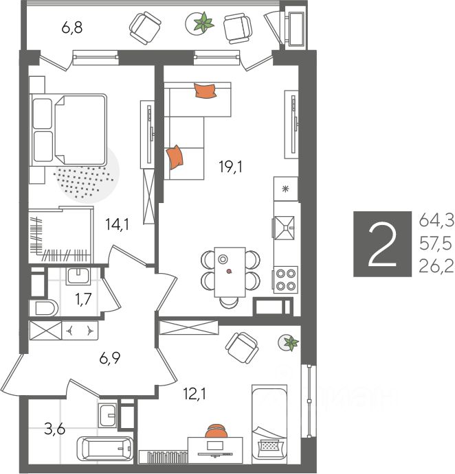 В продаже 2-комнатная квартира от застройщика! ЖК "Рекорд" 2 очередь, г. Краснодар, Литер 5 Срок сдачи: 4 кв. 2026, общей площадью 64.3 кв.м., на 16 этаже.