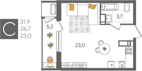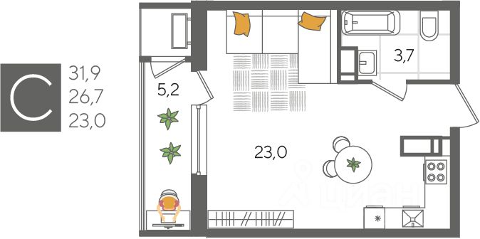 В продаже квартира-студия от застройщика! ЖК "Рекорд" 2 очередь, г. Краснодар, Литер 5 Срок сдачи: 4 кв. 2026, общей площадью 31.9 кв.м., на 24 этаже.