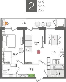 В продаже 2-комнатная квартира от застройщика! ЖК "Рекорд" 2 очередь, г. Краснодар, Литер 5 Срок сдачи: 4 кв. 2026, общей площадью 61.6 кв.м., на 22 этаже.