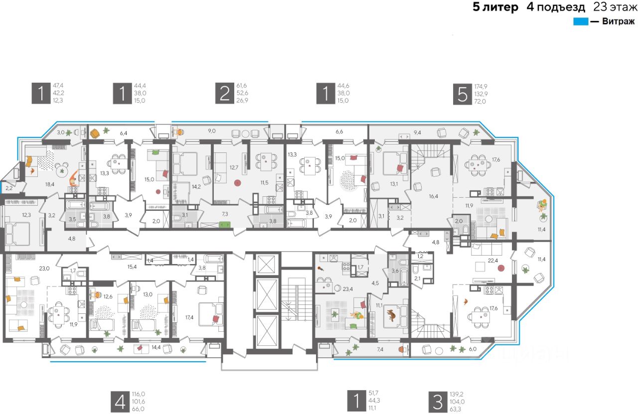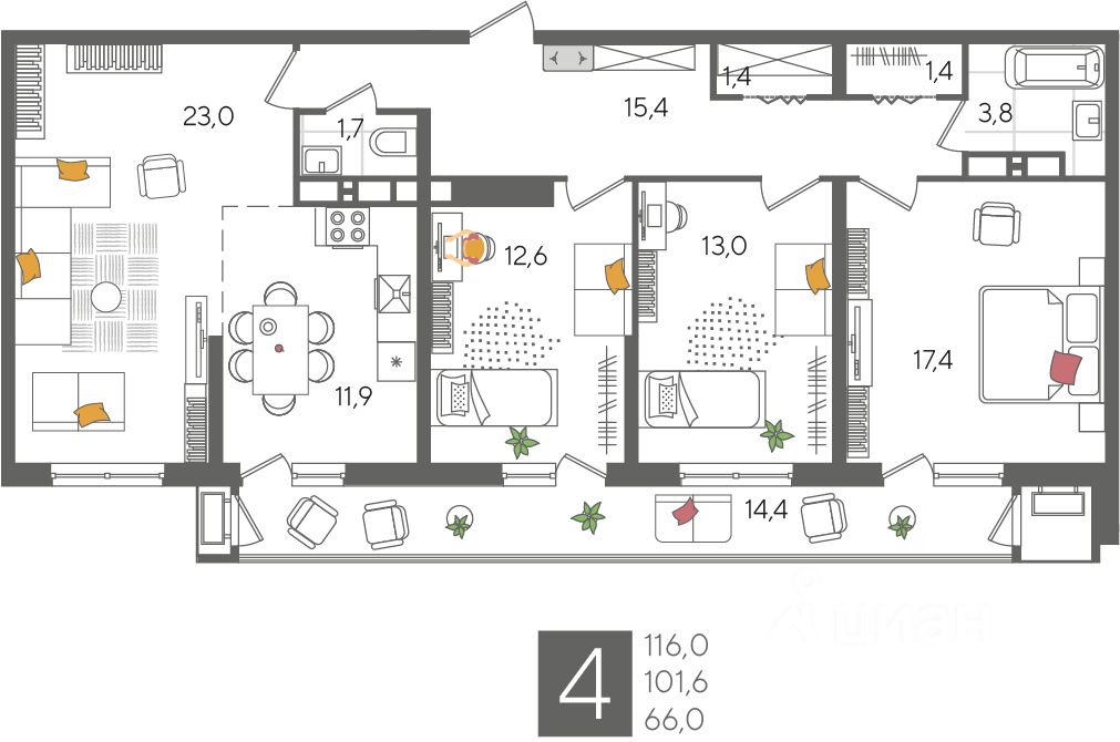 В продаже 4-комнатная квартира от застройщика! ЖК "Рекорд" 2 очередь, г. Краснодар, Литер 5 Срок сдачи: 4 кв. 2026, общей площадью 116 кв.м., на 23 этаже.