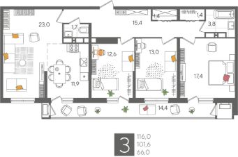 В продаже 3-комнатная квартира от застройщика! ЖК "Рекорд" 2 очередь, г. Краснодар, Литер 5 Срок сдачи: 4 кв. 2026, общей площадью 116 кв.м., на 24 этаже.