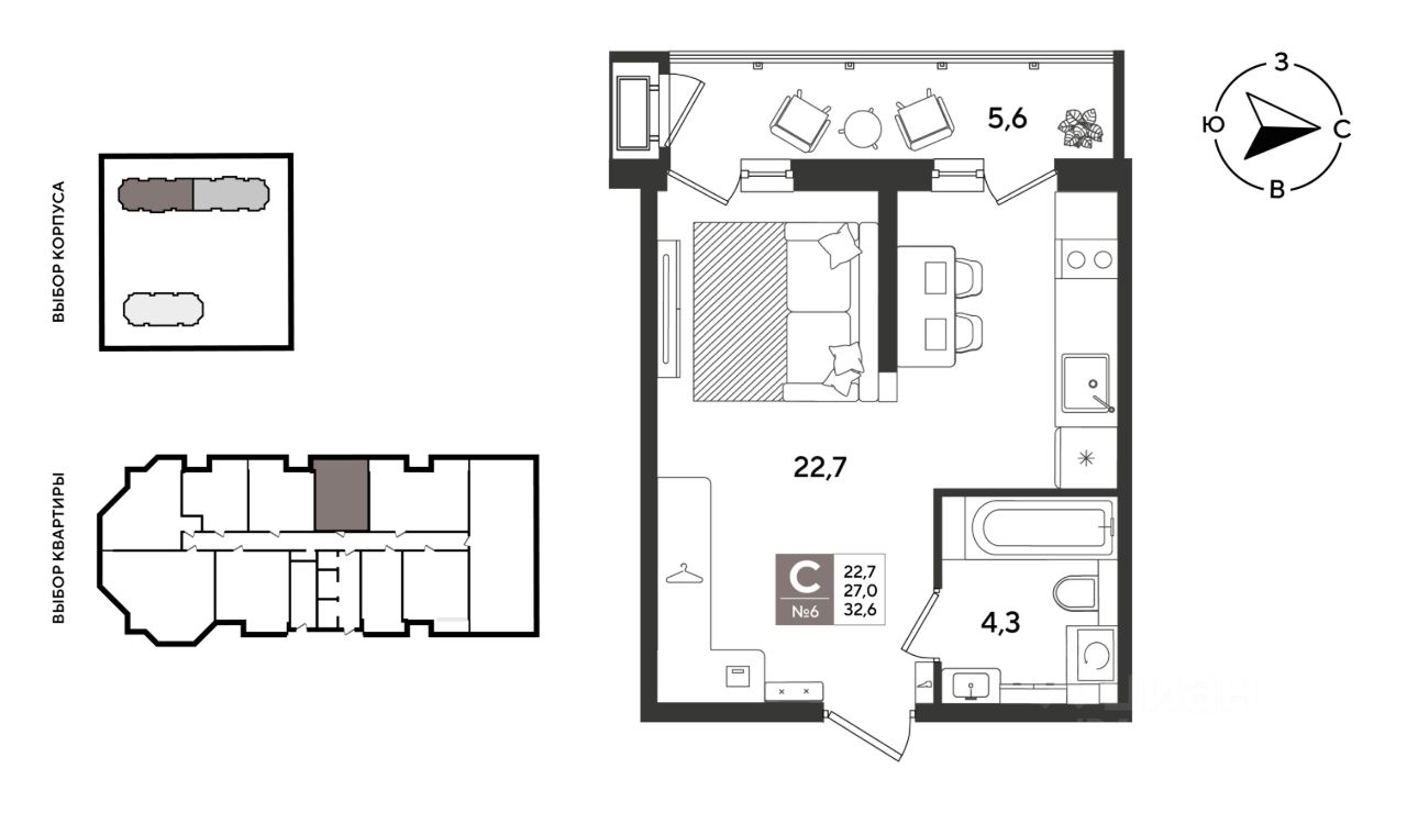 В продаже студия от застройщика! ЖК "Рекорд" 2 очередь, г. Краснодар, Литер 3. Срок сдачи: 2 кв. 2026, общей площадью 32.6 кв.м., на 2 этаже.