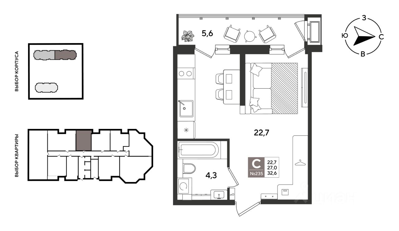 В продаже студия от застройщика! ЖК "Рекорд" 2 очередь, г. Краснодар, Литер 3. Срок сдачи: 2 кв. 2026, общей площадью 32.6 кв.м., на 2 этаже.