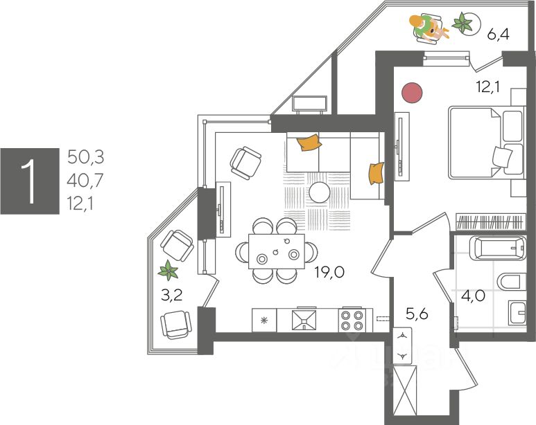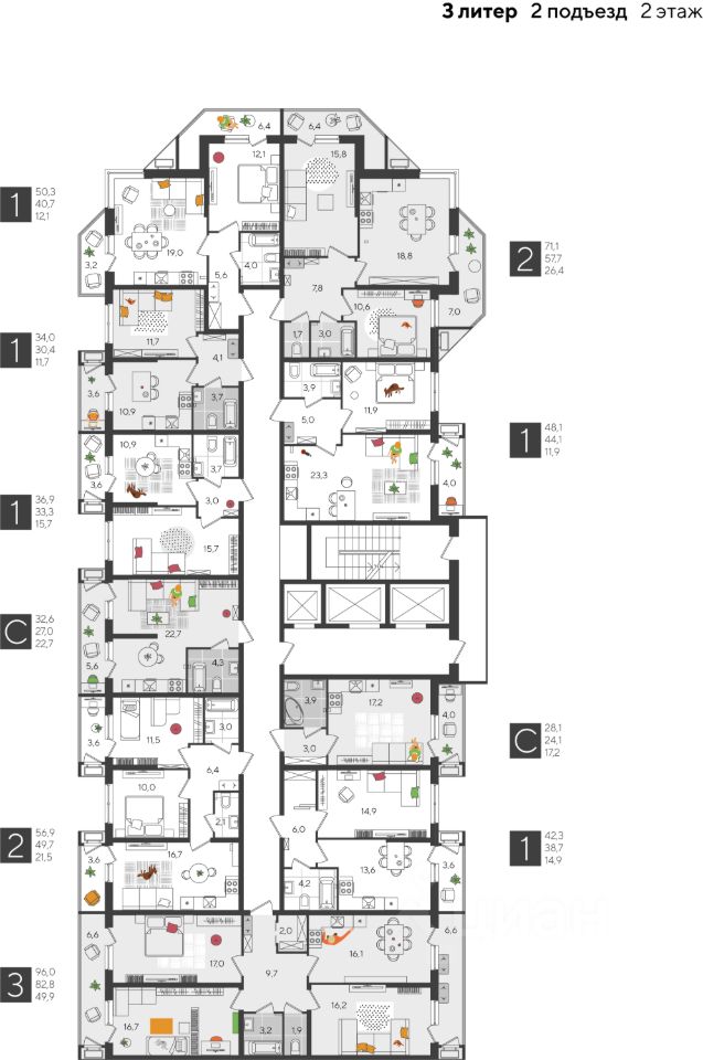 В продаже 1-комнатная квартира от застройщика! ЖК "Рекорд" 2 очередь, г. Краснодар, Литер 3 Срок сдачи: 4 кв. 2026, общей площадью 50.3 кв.м., на 2 этаже.