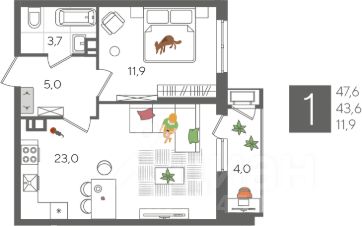 В продаже 1-комнатная квартира от застройщика! ЖК "Рекорд" 2 очередь, г. Краснодар, Литер 3 Срок сдачи: 4 кв. 2026, общей площадью 47.6 кв.м., на 8 этаже.