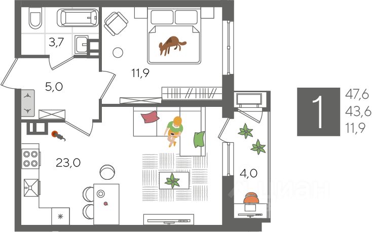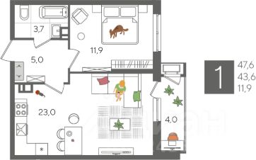 В продаже 1-комнатная квартира от застройщика! ЖК "Рекорд" 2 очередь, г. Краснодар, Литер 3 Срок сдачи: 4 кв. 2026, общей площадью 47.6 кв.м., на 9 этаже.