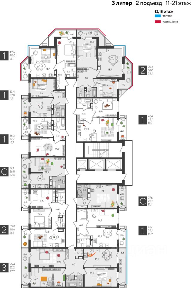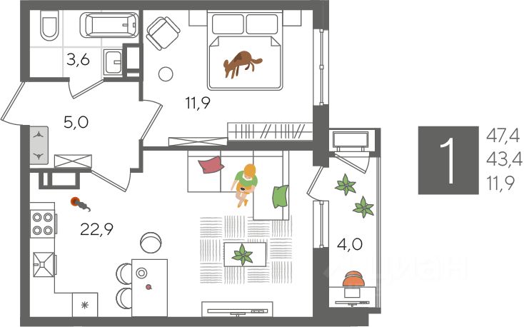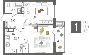 В продаже 1-комнатная квартира от застройщика! ЖК "Рекорд" 2 очередь, г. Краснодар, Литер 3 Срок сдачи: 4 кв. 2026, общей площадью 47.4 кв.м., на 12 этаже.