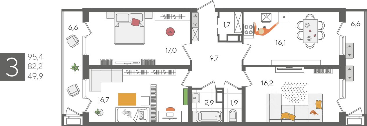 В продаже 3-комнатная квартира от застройщика! ЖК "Рекорд" 2 очередь, г. Краснодар, Литер 3 Срок сдачи: 4 кв. 2026, общей площадью 95.4 кв.м., на 17 этаже.