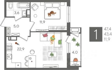 В продаже 1-комнатная квартира от застройщика! ЖК "Рекорд" 2 очередь, г. Краснодар, Литер 3 Срок сдачи: 4 кв. 2026, общей площадью 47.4 кв.м., на 18 этаже.