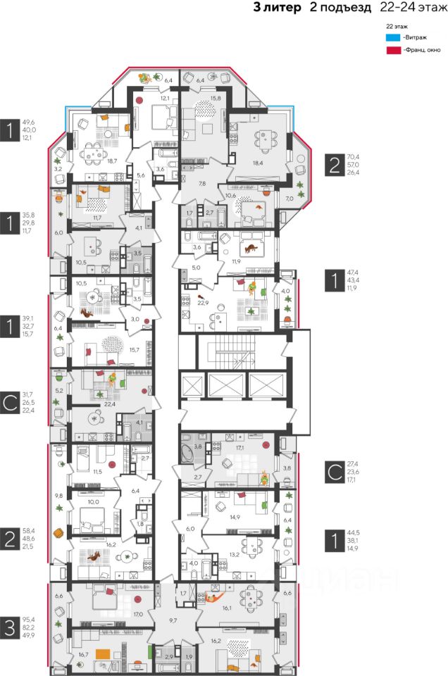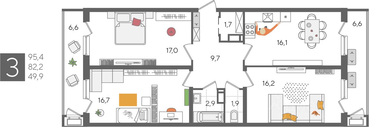 В продаже 3-комнатная квартира от застройщика! ЖК "Рекорд" 2 очередь, г. Краснодар, Литер 3 Срок сдачи: 4 кв. 2026, общей площадью 95.4 кв.м., на 22 этаже.
