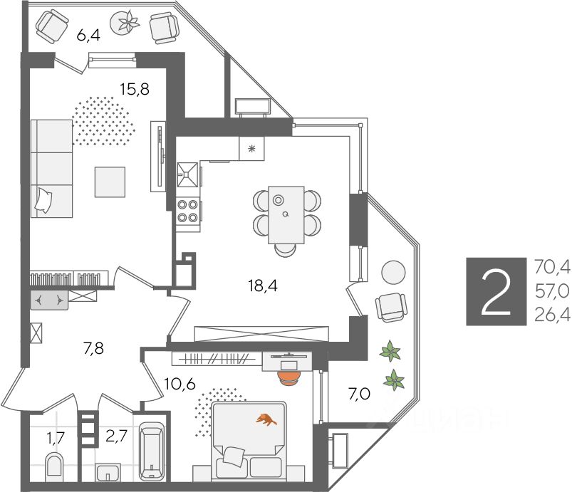 В продаже 2-комнатная квартира от застройщика! ЖК "Рекорд" 2 очередь, г. Краснодар, Литер 3 Срок сдачи: 4 кв. 2026, общей площадью 70.4 кв.м., на 24 этаже.