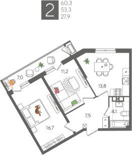 В продаже 2-комнатная квартира от застройщика! ЖК "Рекорд" 2 очередь, г. Краснодар, Литер 2 Срок сдачи: 4 кв. 2026, общей площадью 60.3 кв.м., на 3 этаже.