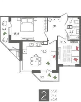 В продаже 2-комнатная квартира от застройщика! ЖК "Рекорд" 2 очередь, г. Краснодар, Литер 2 Срок сдачи: 4 кв. 2026, общей площадью 66.8 кв.м., на 7 этаже.