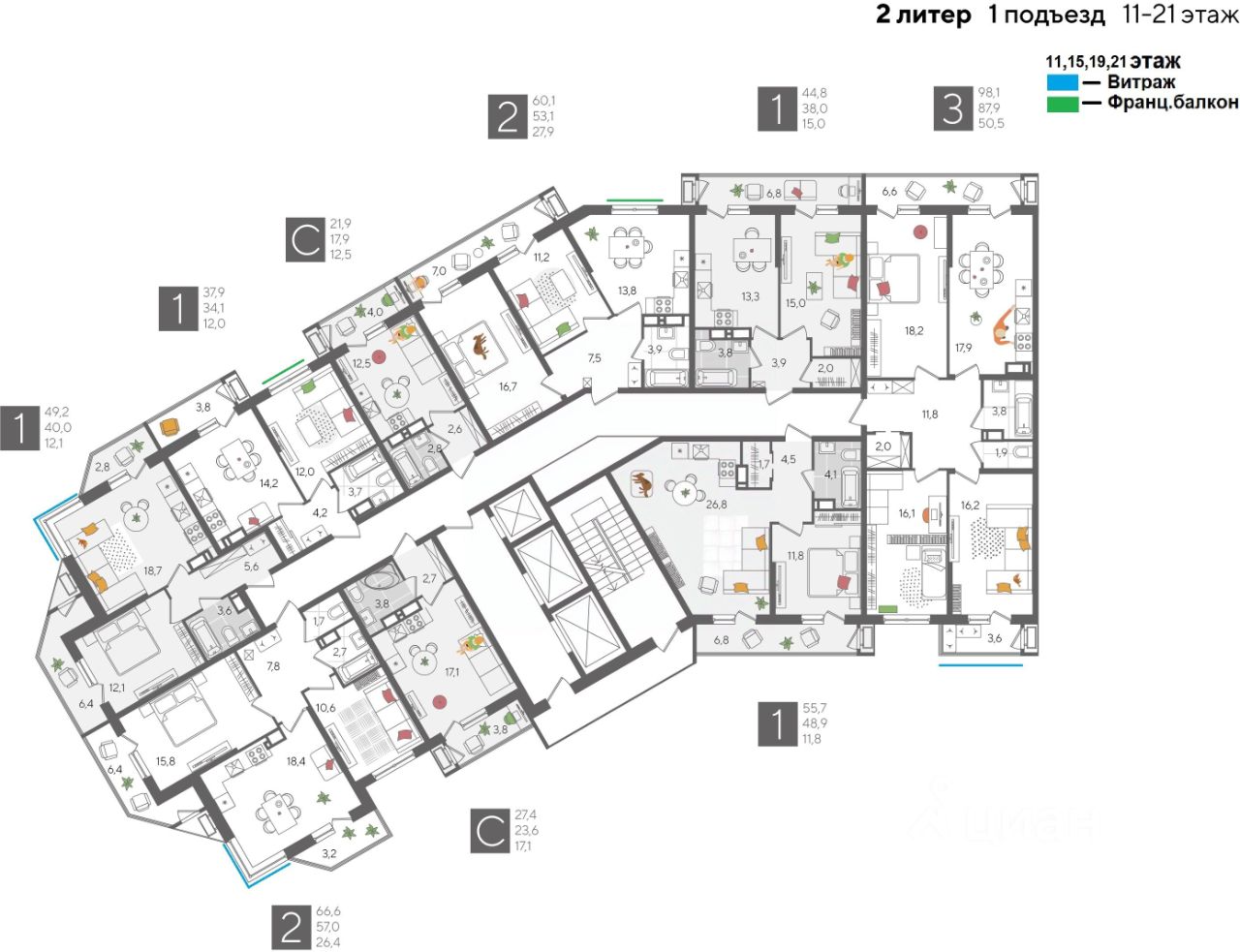 В продаже 3-комнатная квартира от застройщика! ЖК "Рекорд" 2 очередь, г. Краснодар, Литер 2 Срок сдачи: 4 кв. 2026, общей площадью 98.1 кв.м., на 21 этаже.