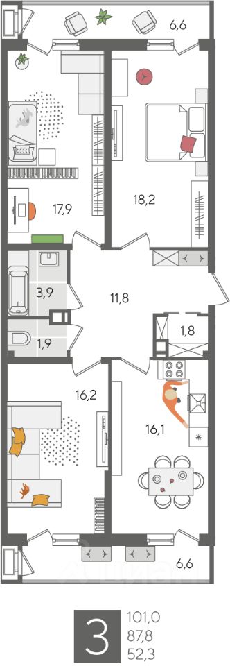 В продаже 3-комнатная квартира от застройщика! ЖК "Рекорд" 2 очередь, г. Краснодар, Литер 2 Срок сдачи: 4 кв. 2026, общей площадью 101 кв.м., на 7 этаже.