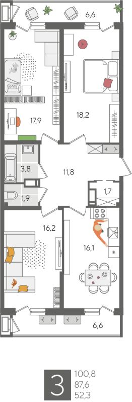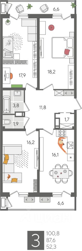 В продаже 3-комнатная квартира от застройщика! ЖК "Рекорд" 2 очередь, г. Краснодар, Литер 2 Срок сдачи: 2 кв. 2026, общей площадью 100.8 кв.м., на 22 этаже.