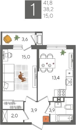 В продаже 1-комнатная квартира от застройщика! ЖК "Рекорд" 2 очередь, г. Краснодар, Литер 2 Срок сдачи: 4 кв. 2026, общей площадью 41.8 кв.м., на 4 этаже.