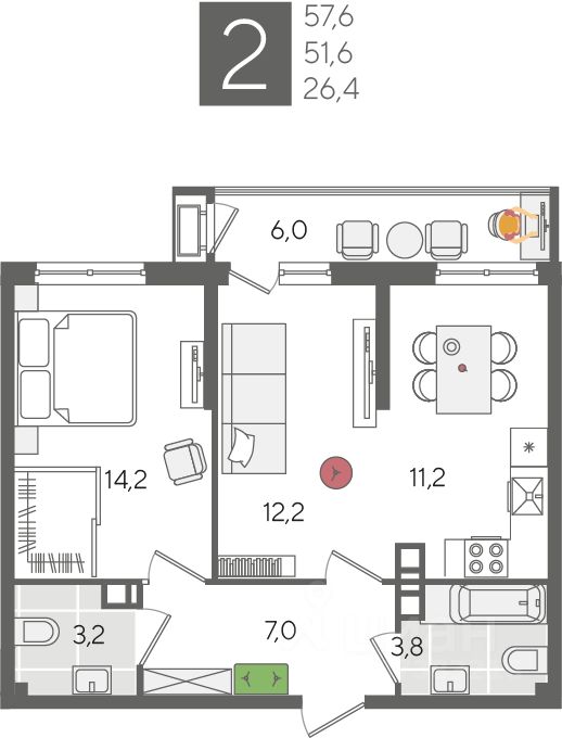 В продаже 2-комнатная квартира от застройщика! ЖК "Рекорд" 2 очередь, г. Краснодар, Литер 2 Срок сдачи: 4 кв. 2026, общей площадью 57.6 кв.м., на 6 этаже.